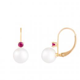 14K Yellow Gold 7-7.5mm White Freshwater Pearl and Ruby Earrings