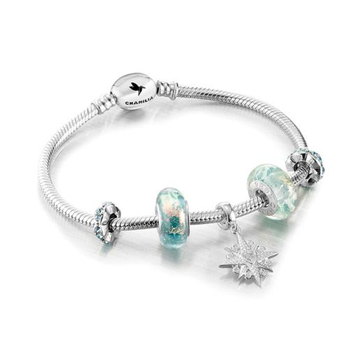 Show your holiday spirit with the Limited Edition Tree Topper Premium Gift Set. This dazzling bracelet is detailed in frosty hues, featuring a brilliant Swarovski Crystal accented star surrounded by aqua colour iridescent glass and more Swarovski Aquamarine Crystal. Your bracelet comes packages in a beautiful leatherette jewellery box; the perfect way to store your treasure. Made with Sterling Silver and Swarovski Crystal, 7.5in bracelet.
