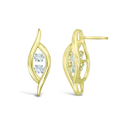 Dancing Diamonds duel in each of these lovely 10kt yellow gold diamond stud earrings. The lovely ribbon shape form around the four Dancing Diamonds for a total carat weight of 0.25ctw. The earring is secured with a post and butterfly back. The perpetual motion of the Dancing Diamond will waltz to the beat of her heart.