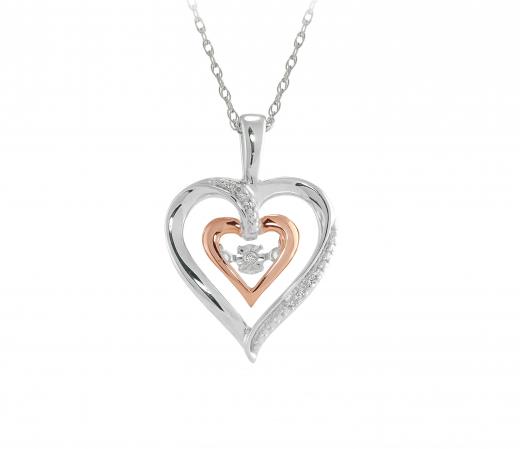 Show her you care and treat her to this pretty Dancing Diamond pendant. Featuring a sterling silver heart design framing an inner 10kt rose gold heart and at its core a sparkling 0.03ct Dancing Diamond. This pendant sways from an 18" chain and will make a truly meaningful gift.