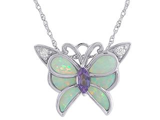 This vibrant butterfly necklace is crafted in lustrous sterling silver and features created opal, a marquise cut amethyst and shimmering created white sapphires. This gemstone necklace is sure to make a standout addition to any jewellery collection. Choose this shimmering piece either for yourself or as a special gift for someone you love.