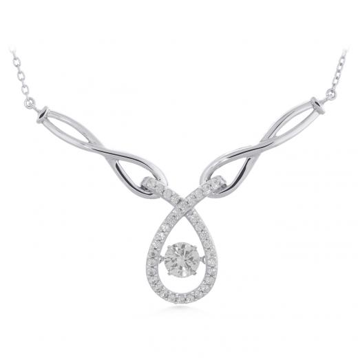 An infinity style design is adorned with round sparkling created white sapphires in this dazzling dancing pendant. The extravagant centre stone moves, catching light from every angle. The necklace sways from an 18-inch chain with secure spring clasp.