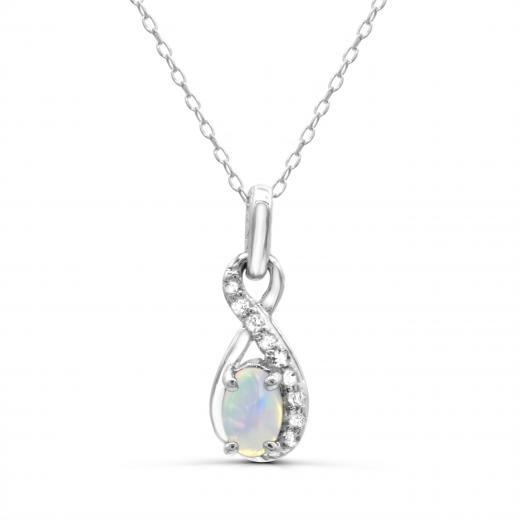 This modern yet classic, infinity design pendant is crafted in gleaming sterling silver and is sure to become a favourite item in your jewellery collection. This item is perfectly adorned with shimmering white topaz and an oval cut opal, which is the birthstone for October. If you are looking for something stunning, order this for yourself or someone you love today!