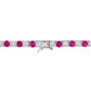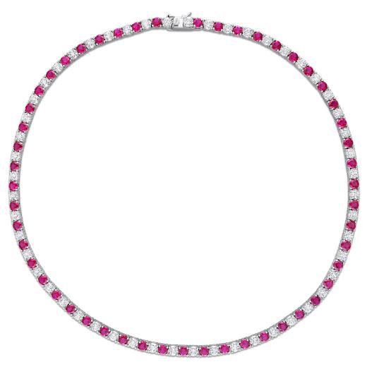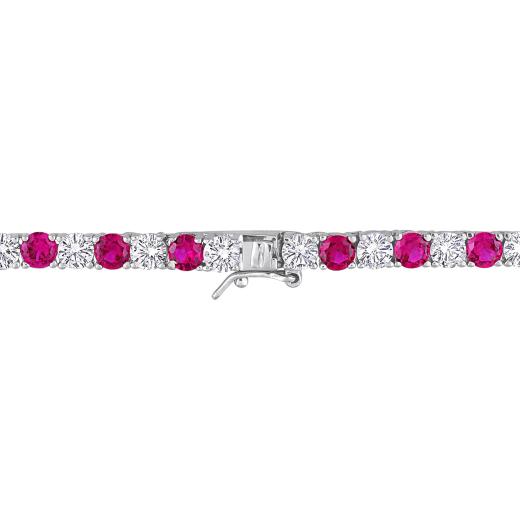 An ideal gift for a woman who loves stones, this Created Alternating White Sapphire and Ruby Tennis Bracelet and Necklace Set is indeed a striking piece. Crafted in lustrous sterling silver, this dual-colour 17-inches long stunning necklace showcases 51 round-cut, white created sapphire (4x4mm) and 52 round created ruby (4x4mm) gemstones. The matching classy, 7.25" long bracelet features 21 round-cut white created sapphire gemstones (4x4mm) and 21 created round-cut ruby gemstones. Finished with a brilliant shine, the necklace, and the bracelet set are secured with a tongue and groove clasp. Coordinate with a beautiful red cocktail dress for a flattering look.