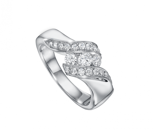 Be in complete harmony with this 10k white gold .55ctw round brilliant three-stone diamond bridal ring with channel set diamond accents