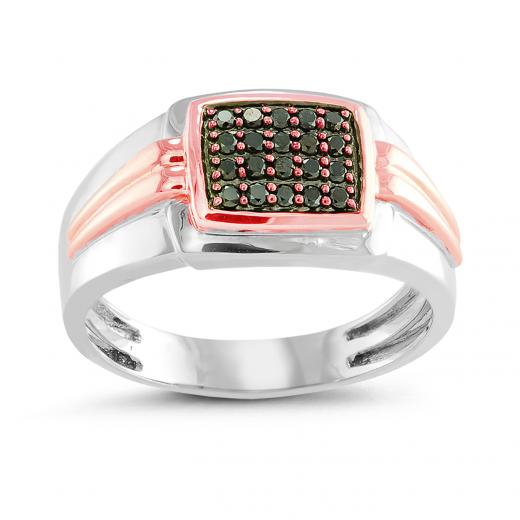 This strongly defined sterling silver men’s ring is the perfect choice both as a wedding band, and a fashion statement. This unique ring features a plateau of jet black diamonds surrounded by a border of rich rose gold perfect contrast. The ring has a total diamond weight of .25 carat.
