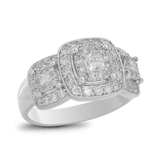 This modern 14k white gold diamond ring charms with magnificent sparkle. Crafted with a three-stone clustered design, this 1ctw ring features a princess cut diamond at the centre of each cluster, with a squared double halo.