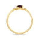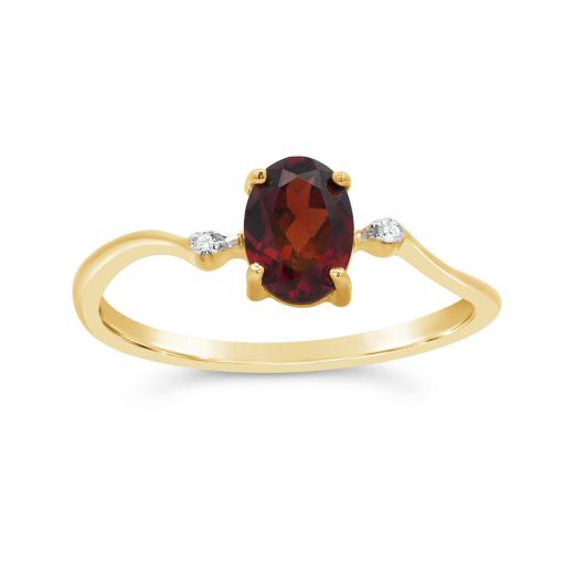 This classic ring is set in 10-karat yellow gold and features an oval cut genuine garnet accented on either side by a shimmering diamond. Buy this for yourself or the garnet lover in your life!