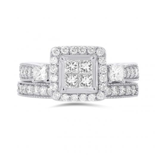 Created in perfect harmony, this 1ctw white gold bridal set is a perfect match. Featuring princess cut diamonds at its centre, this bridal set sparkles endlessly with romantic details.