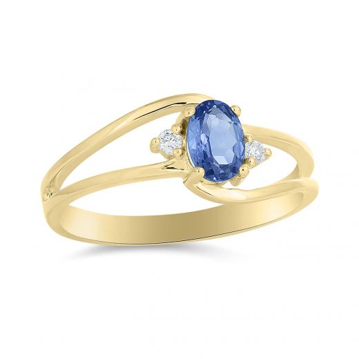 This classic yet modern ring features an oval-cut tanzanite centre stone with diamonds set on either side. This 10k yellow gold ring glimmers with highly polished finish.
