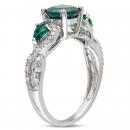 This stylish three-stone ring features a round-cut created emerald center stone flanked by two pear-cut created emerald side stones and round white diamond accents. This gorgeous ring is finely crafted of sterling silver and glimmers with a high polish finish.