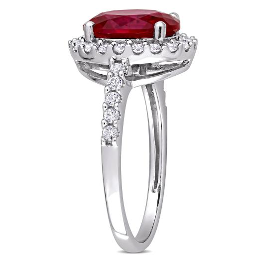 Radiate your feminine glow with this elegant Created Ruby and Created White Sapphire Halo Ring. Mounted in lustrous white gold, it features an oval-cut, prong-set created ruby gemstone (10 x 8mm) at the center with 30 round-cut, buttercup-set created white sapphire gemstones forming a halo and studded along the band. Enhanced with a high polish finish, this gemstone halo ring makes the perfect addition to any jewellery collection.