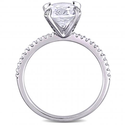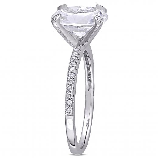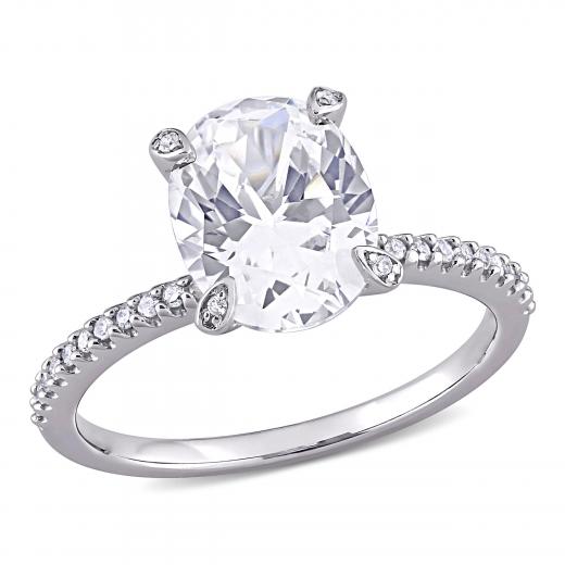 This modern and sophisticated created white sapphire and diamond engagement ring is crafted in white gold and features an oval-cut, prong-set created white sapphire gemstone at the center with a total of 26 round-cut, buttercup and pave-set diamonds adding a touch of shimmer along each prong as well as along its delicate band. A modern take on a classic bridal style this gemstone and diamond ring is a perfect choice for the woman you love as you celebrate this special milestone and begin the next chapter of your lives together.