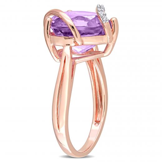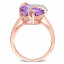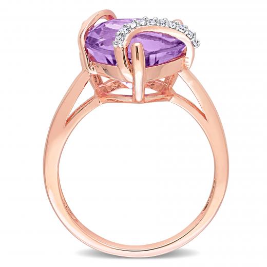 This opulent amethyst and diamond heart ring is crafted in radiant pink silver. This ring features one heart-cut, prong-set, glittering amethyst gemstone at the centre of the ring and 10 round-cut, prong-set, shimmering diamonds that are beautifully embellished on the ring. Slip this exquisite gemstone and diamond heart ring on your finger and fall in love with its delicate beauty and shimmering brilliance.