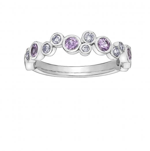 This fabulous stacking anniversary ring is crafted in 10k white gold. This pretty band features alternating round-cut pink sapphires and shimmering diamonds. Enhanced with a high polish finish, this stackable ring is the perfect addition to any jewellery collection. Whether worn as an anniversary band, wedding band or simply a gorgeous gemstone accessory, this ring is a great gift for anyone with a classic and trendy sense of style.