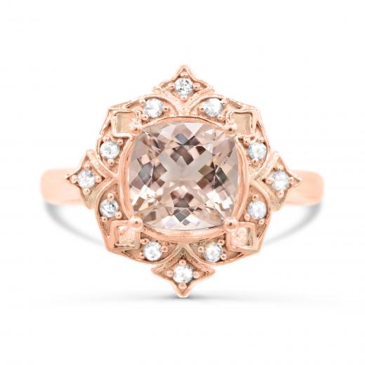 This modern and sophisticated ring is crafted in lustrous 10-karat rose gold and features a cushion-cut morganite stone at the centre, accented with white sapphires. This ring is sure to be the perfect gift either for yourself or your loved one.