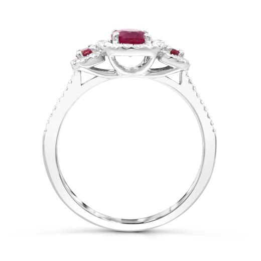 This ring is a true show stopper! This lovely halo design hugs these beautiful rubies with twinkling diamonds. It is a gorgeous piece that makes a real statement. The 14-karat white gold setting is a stunning piece that truly embodies and picture frames these stunning stones.