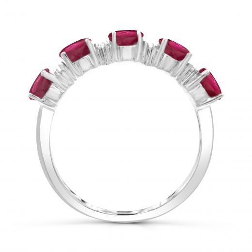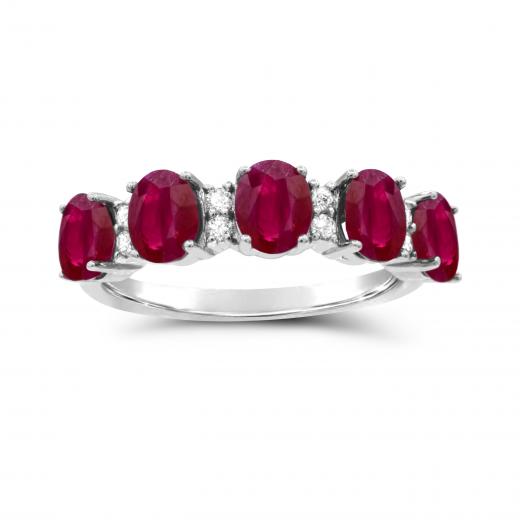 This bold and bright ruby and diamond band is crafted in lustrous 14-karat white gold and features five oval-cut ruby stones accented with 8 round-cut diamonds in a classic ring design. With exquisite luster and a brilliant shine, this gemstone and diamond anniversary band is sure to make a standout addition to any jewellery collection.