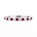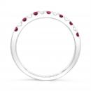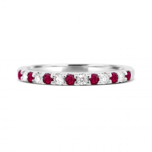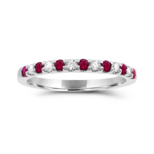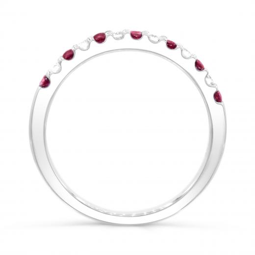 This charming ring features seven round cut rubies and six brilliant cut diamonds. This magnificent band is crafted in lustrous 14k white gold and is sure to add a touch of elegance to your collection.