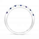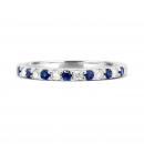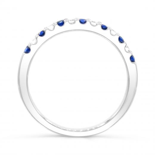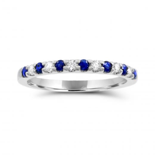 This charming ring features seven round cut sapphires and six brilliant cut diamonds. This magnificent band is crafted in lustrous 14k white gold and is sure to add a touch of elegance to your collection.