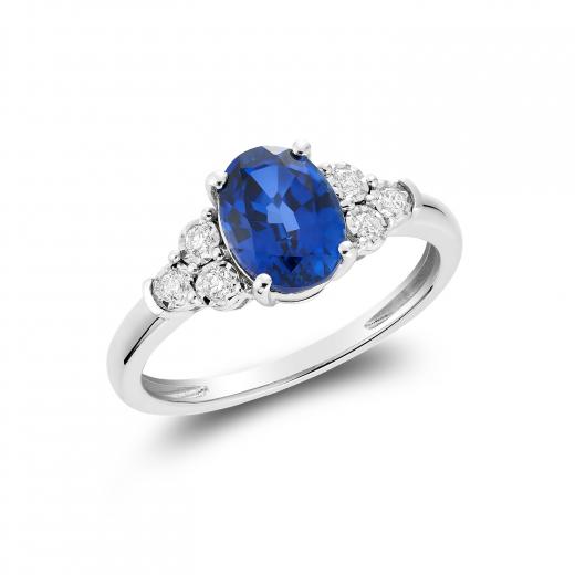 This exquisite ring, crafted in 10-karat white gold, features a stunning created sapphire gemstone and is accentuated by a total of 0.09 carats of diamonds. The deep blue of the created sapphire, combined with the brilliance of the diamonds, creates a captivating and elegant piece of jewellery.