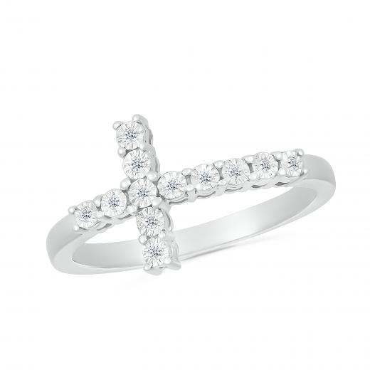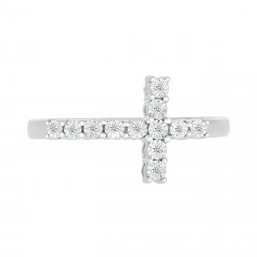 Crafted with precision and attention to detail, this ring features a delicate cross motif adorned with shimmering diamonds. The sterling silver band beautifully complements the design, adding a touch of sophistication and durability. The diamonds, carefully selected for their brilliance and clarity, add a captivating sparkle that catches the light with every movement.