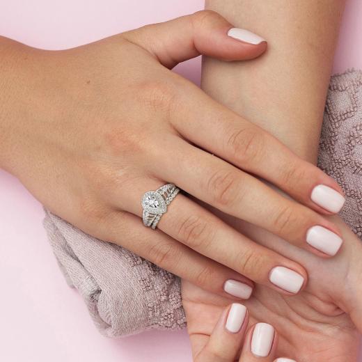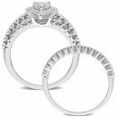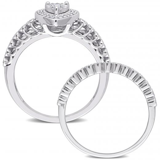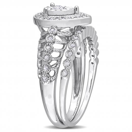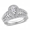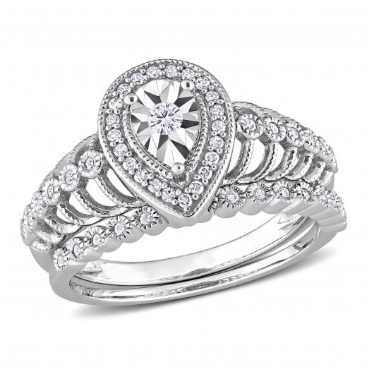 This pretty teardrop halo bridal ring set is crafted in lustrous sterling silver. This stunning ring set features 50 round-cut shimmering diamonds that are beautifully embellished on the ring in pave, prong and bezel settings. This unique wedding ring is complemented by a matching stackable semi-eternity style wedding band. Enhanced with a milgrain finish, this halo diamond bridal set is a perfect symbol of your everlasting love and a beautiful addition to any jewelry collection.