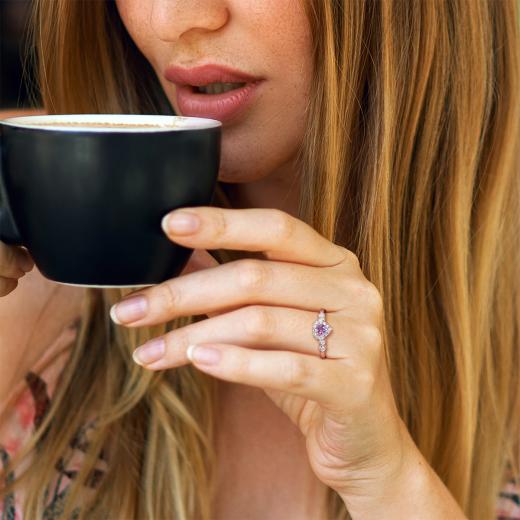 Get your glam on with this exceptional amethyst created white sapphire and diamond accent heart halo ring. Crafted in lustrous rose plated sterling silver, this classic ring features a heart-cut, prong set, amethyst decorated with a halo created by 12 prong-set created white sapphire gemstones and 4 pave-set diamonds embellished halfway on both sides of the band in heart designs. Finished with a brilliant polish, this promise ring is a perfect gift for your beloved partner.