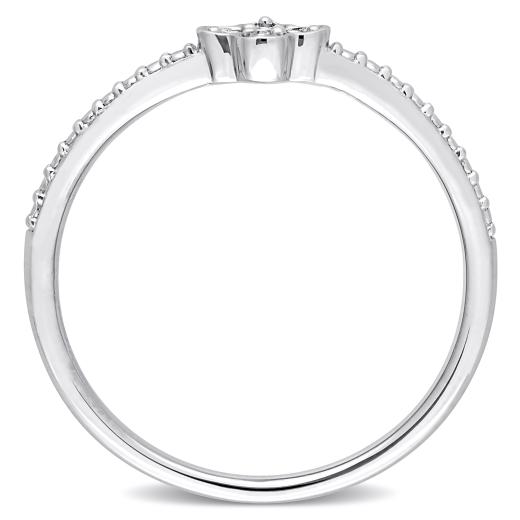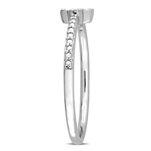 This pretty quatrefoil promise ring is crafted in lustrous sterling silver and features a round-cut pave-set diamond at the center with four round-cut prong-set diamond accents. Polished to a brilliant shine, this promise ring is perfectly matched with any other wedding band or wear alone. Add some shine to your outfit with this glamorous stacking ring.