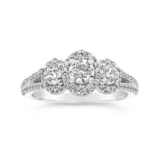 Elevate your elegance with the timeless charm of the 14K White Gold 1.20CTW Diamond Three-Stone Ring. This exquisite piece features a dazzling trio of diamonds, totaling 1.20 carats, set in a classic three-stone halo design. The central round-cut diamond is flanked by two smaller diamonds on each side, creating a harmonious arrangement that symbolizes the past, present, and future. Whether as an engagement ring or a meaningful gift, this piece is a testament to enduring love and enduring style.