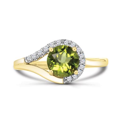 This exquisite ring features a captivating peridot at its center, beautifully complemented by sparkling diamond accents. Crafted in radiant yellow gold, it embodies timeless sophistication and natural allure.