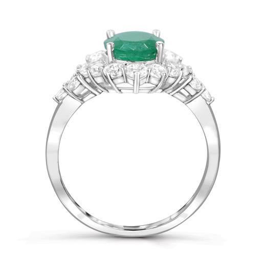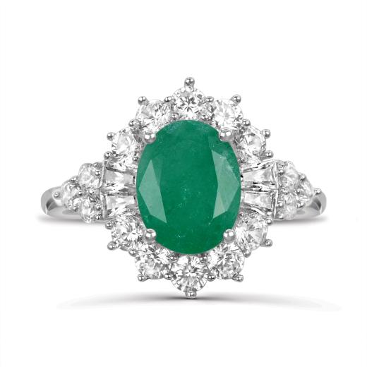 This sterling silver ring features a stunning emerald center stone, surrounded by a halo of sparkling white zircon stones. The contrast between the rich green emerald and the radiant white zircons creates a striking and elegant effect.