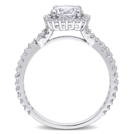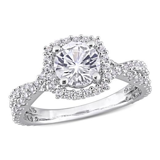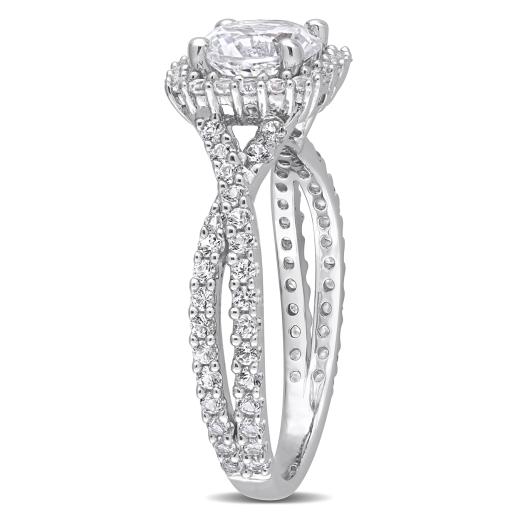 This versatile and elegant Created White Sapphire Halo Infinity Engagement Ring makes a valuable addition to any jewelry collection. Crafted in lustrous sterling silver, this ring features a round-cut, prong-set created white sapphire gemstone (6.5 x 6.5mm) at the center with 20 round-cut, prong-set created white sapphire gemstones forming a halo and an additional 56 round-cut, buttercup-set created white sapphire gemstones resting on the infinity-style band. Enhanced with a high polish finish, give yourself a glamorous look with this sparkling gemstone engagement ring.