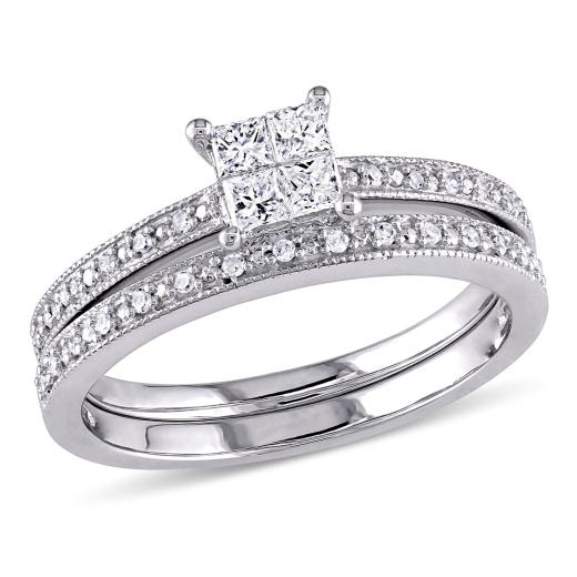 This 1/3 CT Princess and Round Diamonds TW Bridal Set Ring is crafted from 10K white gold and features a total of 1/3 carat diamonds. This bridal set includes an engagement ring and a matching wedding band, each adorned with a combination of princess-cut and round diamonds. The varied cuts enhance the overall brilliance and sparkle of the set. The 10K white gold band adds a sophisticated and timeless touch, making this set a luxurious yet accessible choice for a complete bridal ensemble.