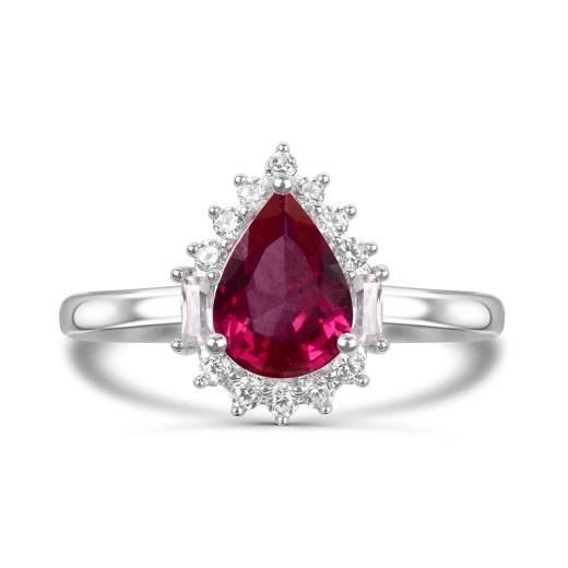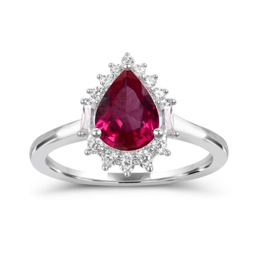 This sterling silver ring showcases a stunning created ruby at its heart, flanked by shimmering created white sapphires that enhance its fiery brilliance. The rich red hue symbolizes passion and confidence, while the white sapphires add a refined touch of sparkle.
