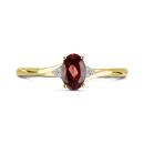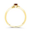 Indulge in the luxe charm of this 10K yellow gold ring, where a garnet gemstone takes center stage. Surrounding the garnet are six shimmering diamonds with a total weight of 0.01 carat, artfully placed to create a delicate halo of brilliance.