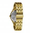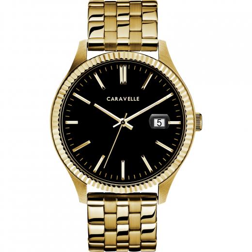 In stainless steel with gold finish, serrated-edge bezel, black dial, luminous hands, calendar, second hand, double-press fold-over clasp, and water resistance to 30 meters.